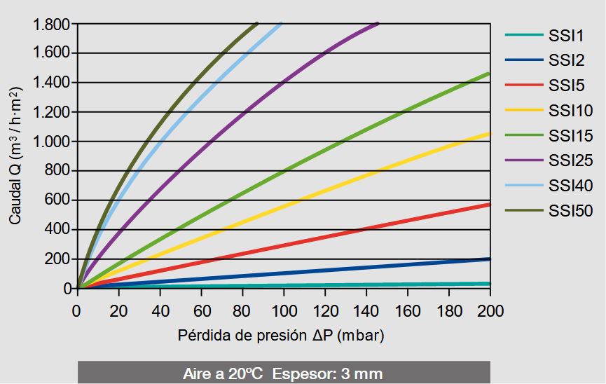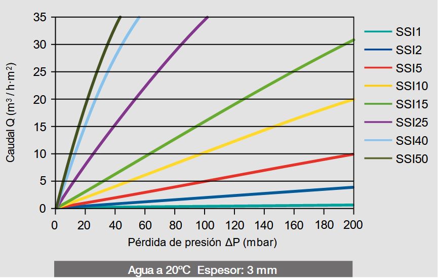 5. Medida en aire con muestras de 2 mm de espesor según norma ISO 4022:2018 en las siguientes condiciones: pendiente de presión 250 s/bar, diferencia de presión máxima 1,5 bar, caudal máximo 3,3 l/s. La permeabilidad en agua es notablemente inferior que en aire: para mas