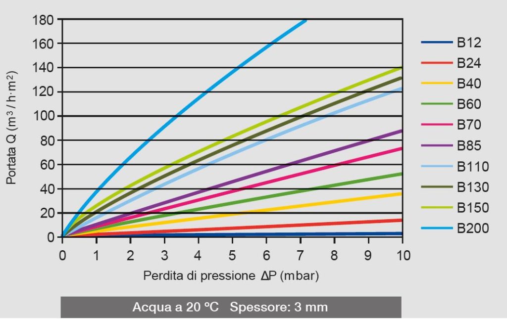 5. Misurata in aria con campione di spessore di 3 mm in conformità alla norma ISO 4022:2018 nelle seguenti condizioni: gradiente di pressione 250 s/bar, differenza di pressione massima 1,5 bar, portata massima 3,3 l/s. La permeabilità in acqua è notevolmente inferiore a quella in aria: per maggiori informazioni consultare il nostro Ufficio Tecnico su www.amespore.com.